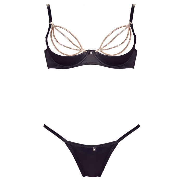 A beautiful lingerie set made out velvety soft satin. The slightly padded shelf bra frames the breasts with 3 gold-coloured rhinestone chains over each breast. The string is also accentuated with 3 rhinestone chains over the buttocks. All chains can be removed.