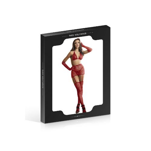 Το Paris Hollywood προσφέρει ένα σετ 3 τεμαχίων με υψηλής ποιότητας στρας. Το σετ περιλαμβάνει ένα τοπ, ένα στρινγκ, μια ζαρτιέρα και ένα ζευγάρι γάντια και καλσόν.